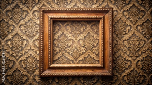 Old wooden picture frame on a beautiful damask background with intricate patterns and colors, classic look, traditional style