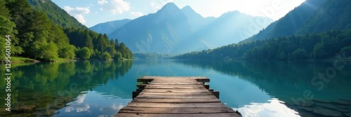 Old wooden pier on tranquil lake; lush forest and majestic peaks, still, visual, trees