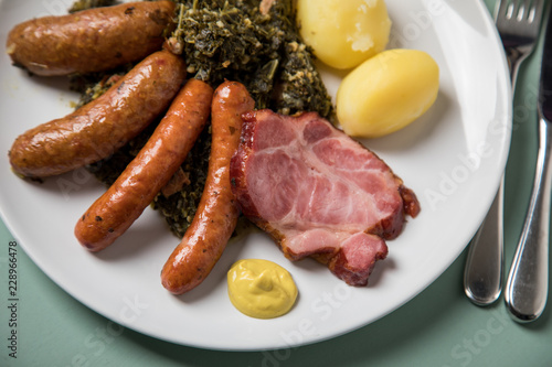 Oldenburger Grünkohl mit Pinkel, Kohlwurst, Kassler Nacken, Kartoffeln und Senf