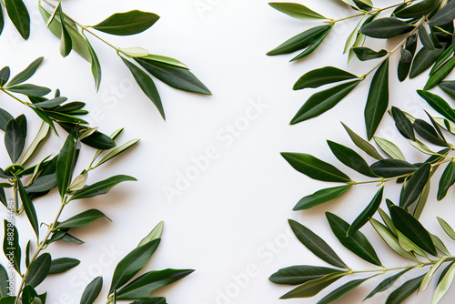 Olive branch with leaves on a white background, in a flat lay, top view, space for text. Minimal concept of an olive tree plant in the summer time in the style of olive tree plant.