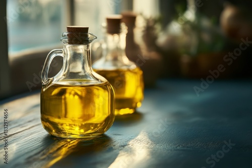 Olive Oil Bottles on a Wooden Tabletop in Natural Sunlight