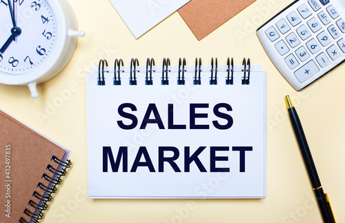 On a light background, a white alarm clock, a calculator, a pen and a notebook with the text SALES MARKET. Flat lay