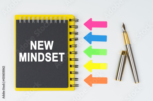 On a white background lies a pen, arrows and a notebook with the inscription - NEW MINDSET