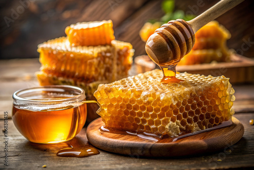 On a wooden board with honeycombs there is a special wooden spoon from which honey drips. In the background there is a small glass bowl filled with honey. Focus concept.