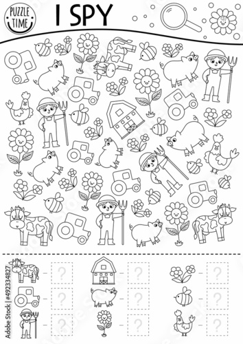 On the farm black and white I spy game for kids. Searching and counting line activity with farmer, tractor, barn, cow. Rural village printable coloring page. Simple country farm puzzle.