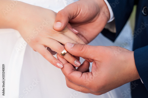 on the wedding day, the husband puts on a wedding ring to the bride in a white dress and it is happiness when two lovers' hearts are united in a family