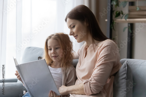 Once upon a time. Interested mother and school age daughter sit on couch engaged in reading fairy tale studying exciting story. Young woman nanny babysitter cultivate love of books in little girl ward