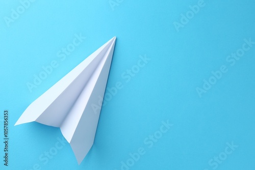 One handmade paper plane on light blue background, top view. Space for text