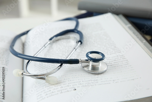 One medical stethoscope and books on white table, closeup