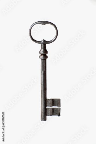 One old vintage metal key on white background. Security concept. Antique objects close up. Castle key secret