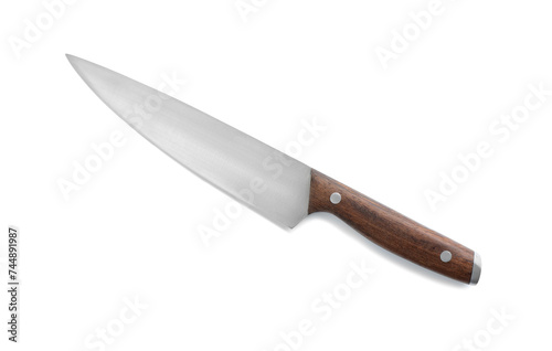 One sharp knife with wooden handle isolated on white, top view