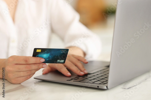 Online banking. Woman with credit card and laptop paying purchase at white marble table, closeup