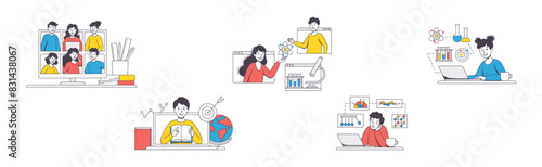 Online Learning with Man and Woman Student and Instructor Engaged in Virtual Classes Outline Vector Set