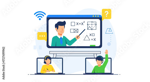 Online Math Class: Teacher and Students in Virtual Classroom.