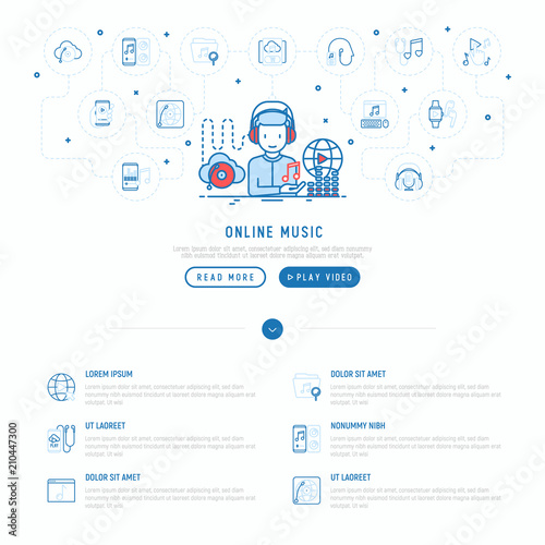 Online music concept: man in headphones listening music from cloud service. Thin line icons: smartphone with mobile app, earphones, equalizer, speaker. Vector illustration, web page template.