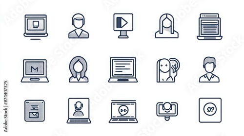 Online Networking thin line icon set. Containing video call, webinar, email outreach, social media, LinkedIn profile, virtual meeting, business forum, online community