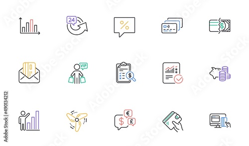 Online payment, Wallet and Piggy bank line icons for website, printing. Collection of Discount message, Graph chart, Diagram graph icons. Checked calculation, Payment methods. Vector