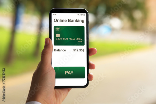 Online payment. Woman using banking app on smartphone outdoors, closeup