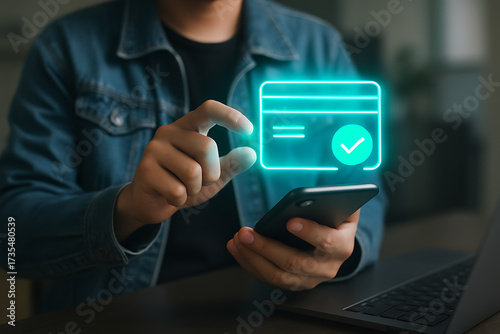 online secure credit card payment concept, a man is holding a mobile phone with a secure payment icon glowing above it, showing successful transaction