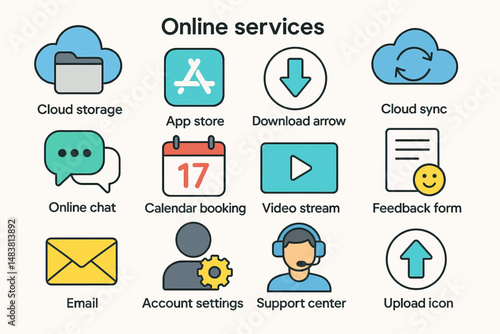 Online services icons: cloud, app, download, chat, calendar, video, feedback, email, support