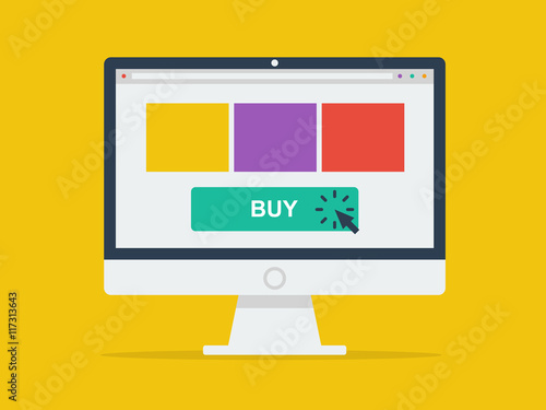 Online Shopping Concept. Desktop Computer on Yellow Background. Flat Design Style.