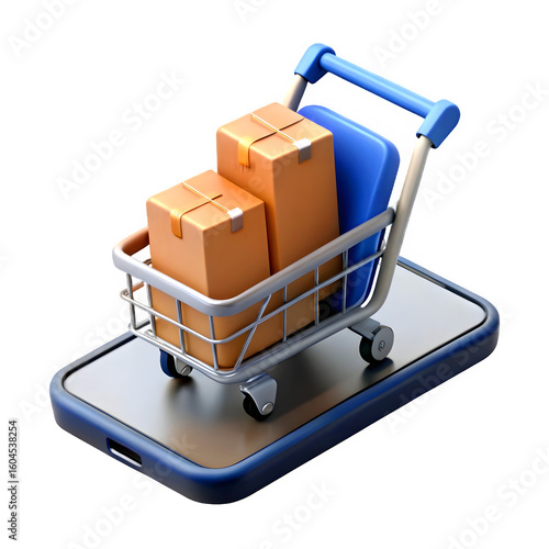 Online shopping ecommerce concept with cart and boxes on mobile phone