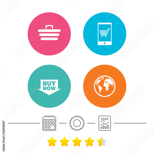 Online shopping icons. Smartphone, shopping cart, buy now arrow and internet signs. WWW globe symbol. Calendar, cogwheel and report linear icons. Star vote ranking. Vector
