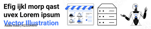 Online storefront with awning, server stack, and humanoid robot with AI interface. Ideal for themes thumbs up e-commerce, AI, robotics, data management, technology, future trends network systems