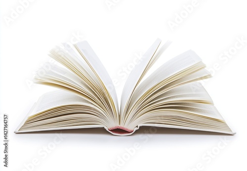 Open antique book, aged pages, blank, white background, design element