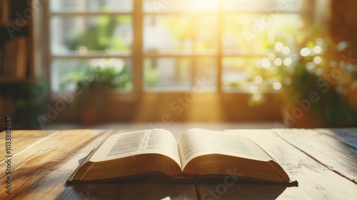 Open Bible placed on a wooden table, bright sunlight streaming through a nearby window, warm and inviting atmosphere, with a soft focus on the text and blurred background with hints of a cozy room