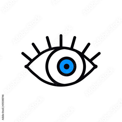 Open blue eye line icon on white background. Look, see, sight, view sign and symbol. Vector linear graphic element. Optical and search theme in minimal design style. Eye with eyelashes.