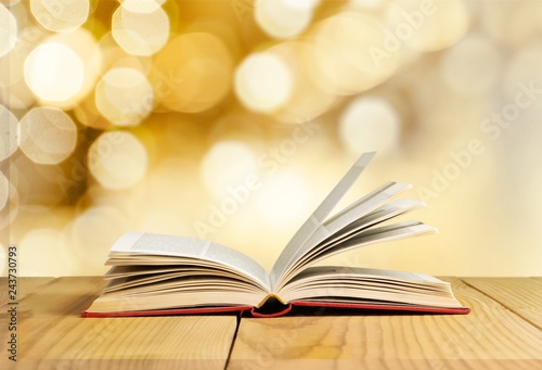 Open book on old wooden table.