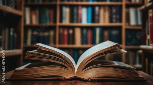 Open book on table in library