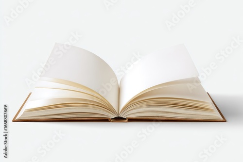Open book with blank, creamy pages; light brown cover, softly shadowed against a white background
