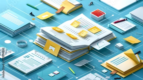 Open Book with Documents, Folders and Sticky Notes on Blue Background.