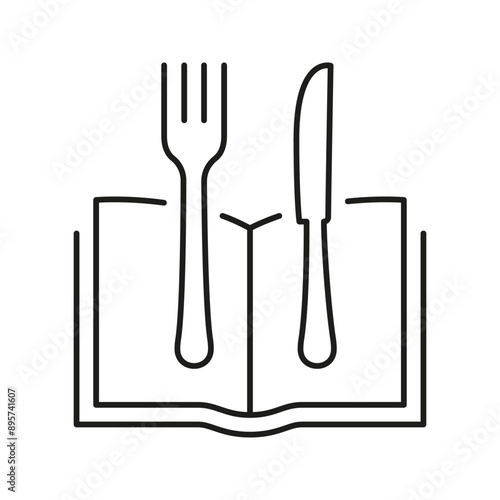 Open Book With Fork And Knife Line Icon Representing Menu And Healthy Dining. Book With Cutlery For Healthy Food And Dining. Cookbook Symbol. Isolated Vector Illustration