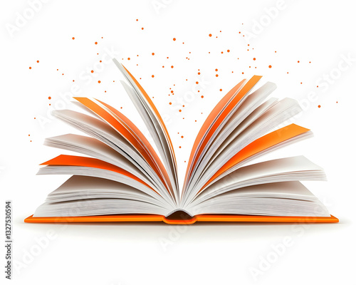 Open book with orange cover, pages spread wide, magical effect
