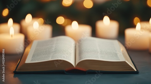 Open book with sacred texts from various religions, pages gently turning, surrounded by candles and soft golden light, representing global faiths