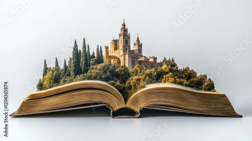 Open book with Spain iconic landmarks such as Santiago de Compostela and Alhambra glowing against a bright white setting.