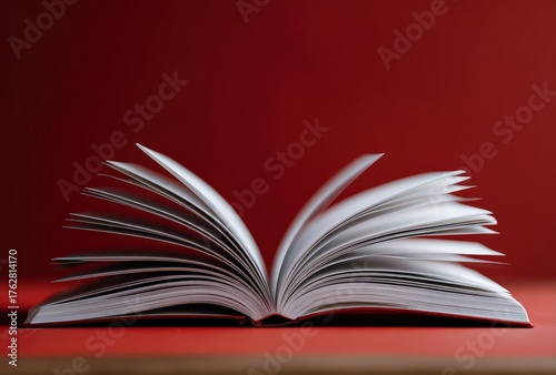 Open book with white pages turning, representing knowledge, education, reading, and learning on a vibrant red background