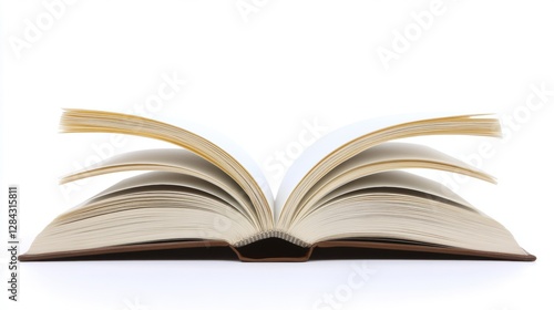 Open Brown Book with White Pages on a White Background Featuring Literature and Reading