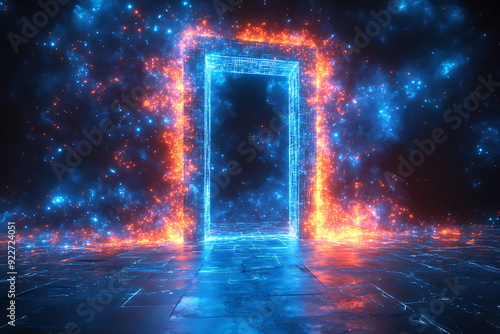Open door icon with light shining through, designed in wireframe style on a dark blue background, symbolizing opportunity and new beginnings.
