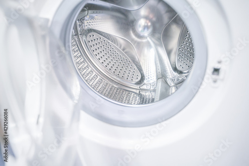 open door of an empty washing machine close up