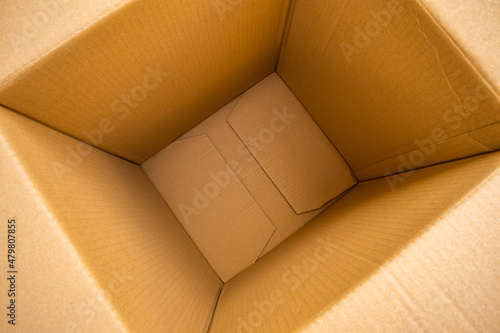 Open empty brown cardboard box background top view