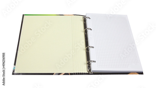 Open multicolored lever arch ring file folder with paper sheets