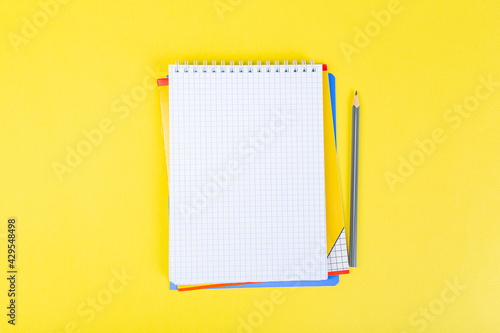 open notepad on yellow background with pencil on top, spiral notepad with blank sheet.