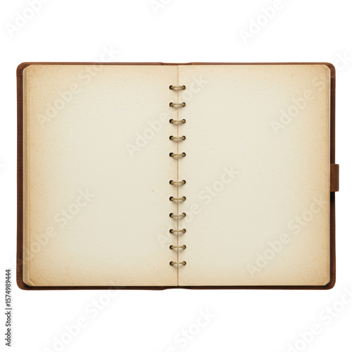 Open old blank notebook with distressed brown leather cover, aged cream pages, and twine stitching, laid flat on a clean white studio background with copy space, top-down view, concept for antique