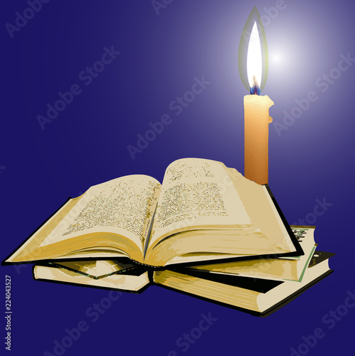 open old book with a candle in the night