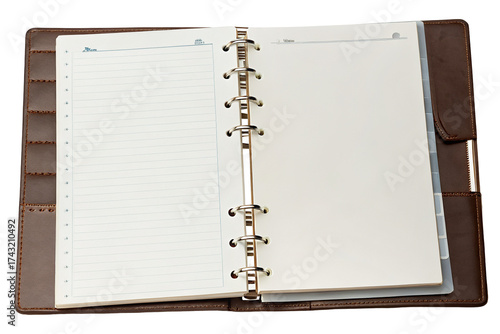 Open planner with lined pages in leather cover for organization and productivity in office work