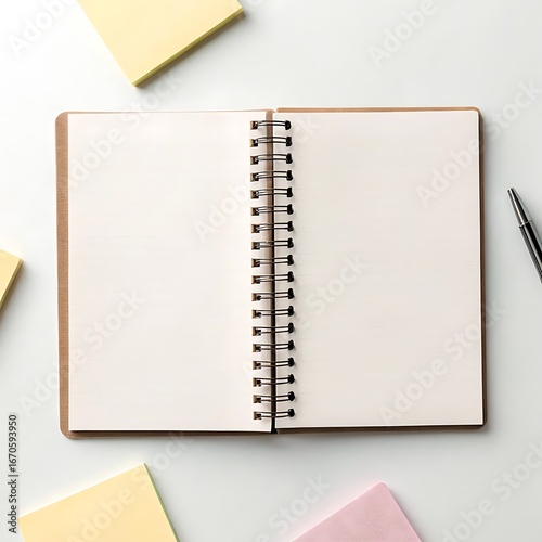 Open spiral notebook with blank pages surrounded by sticky notes and a pen on a white surface top view